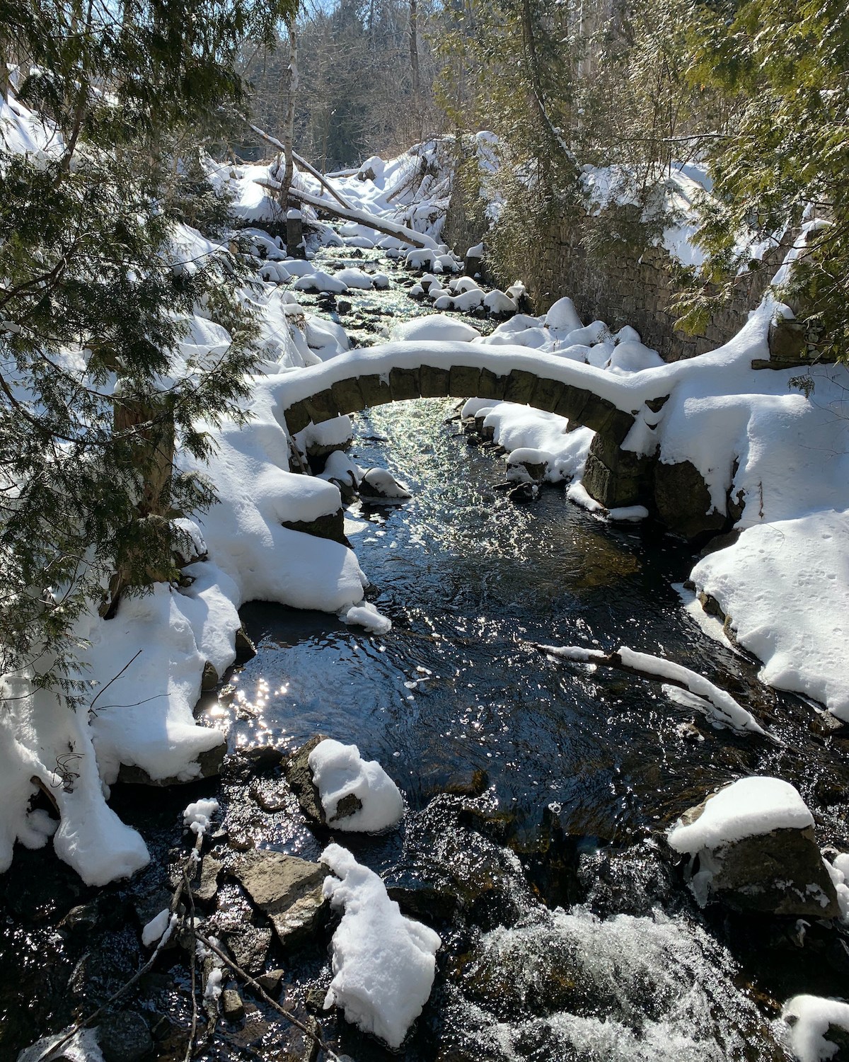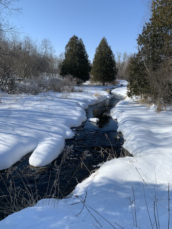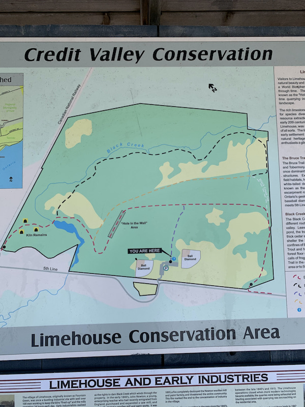 Today we hiked the Bruce Trail from the parking lot, kilometer 20.4 to kilometer 24.1 and took the road back to kilometer 21.5. This next part of the trail took us the idyllic scene of a babbling creek spanned by a stone arch, the remains of an old mill. The historic kilns are on the other side of the bridge.