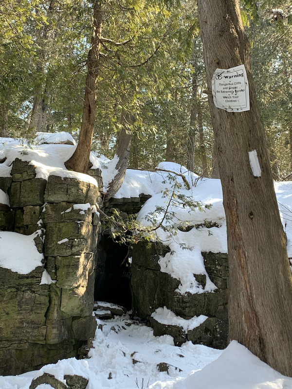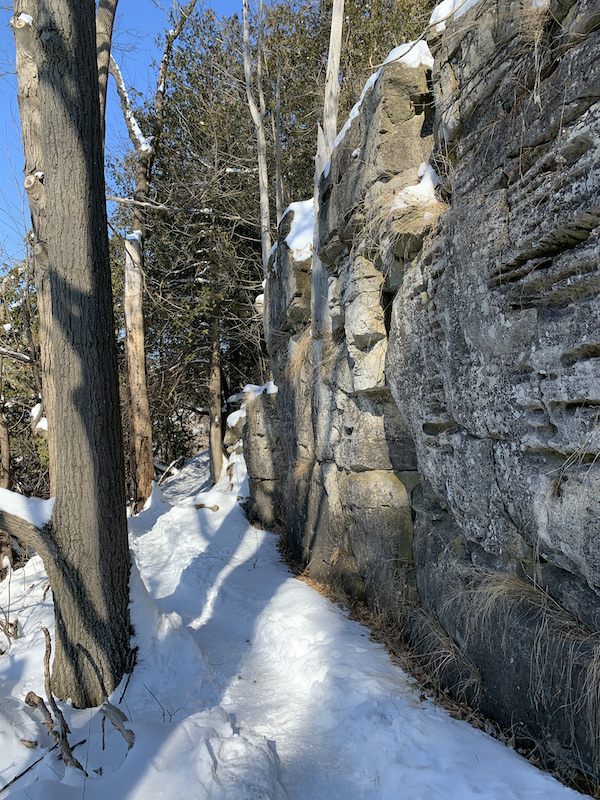 The rest of the Bruce Trail runs along the top of the fissured rocks, with one spot where you must walk or hop over a fissure. Stay on the trail to ensure safe footing.