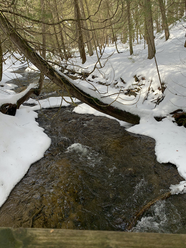 The steep paths were very icy. We happily strolled along at 6 km/hour branching off to take the Tom East Side Trail. This is a hike defined by rolling hills, forests, gentle clear water creeks and meadows. We loved it! The ups and downs didn’t feel so strenuous at that moment.