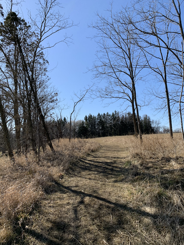 The trail was mostly tree covered and followed behind a network of farm land. A woodpecker was busy building a nest.
