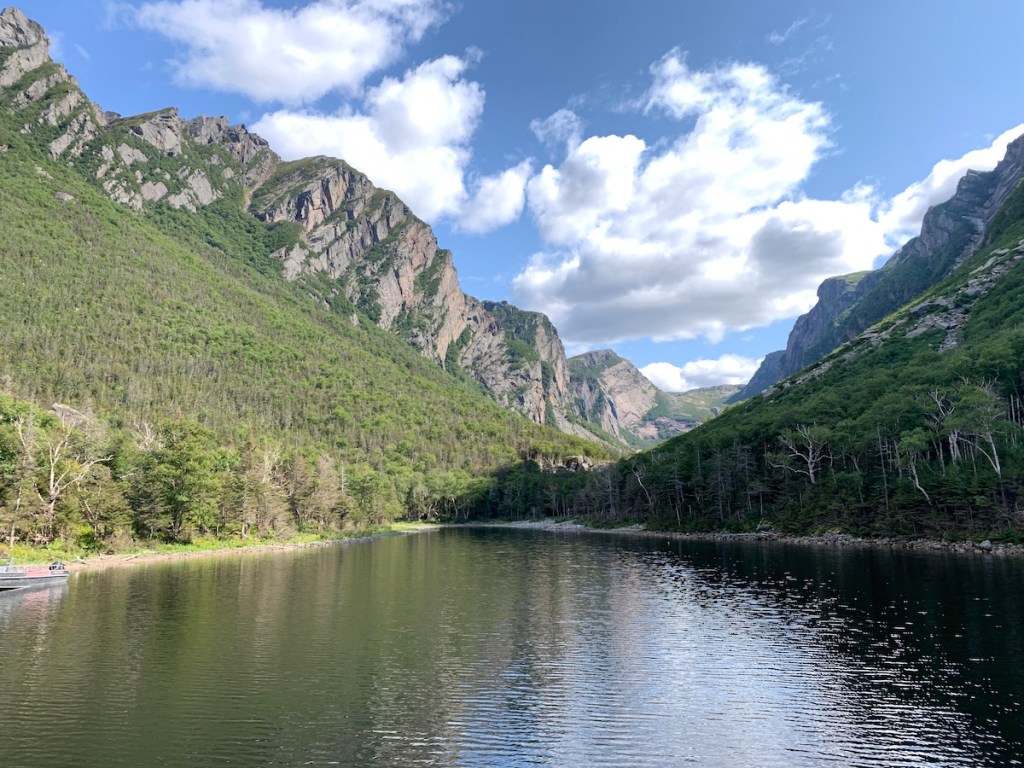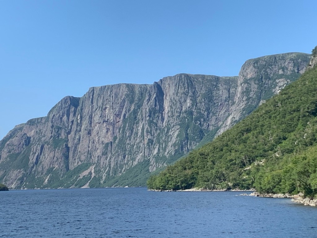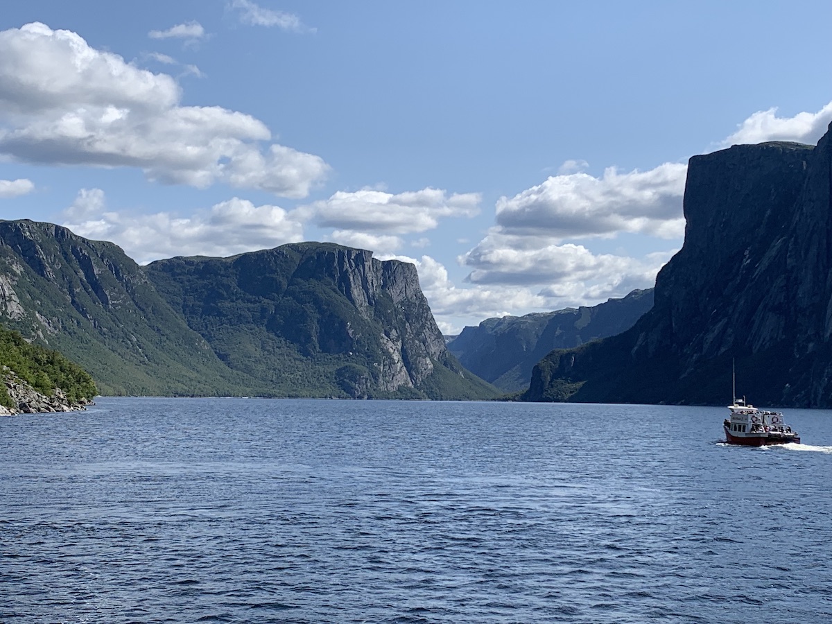 At this point we headed south again towards our main attraction for the day, a boat tour of Western Brook Pond. Western Brook Pond, was a fjord before it became landlocked. Today, this 16km long lake with is sheer ribbon like cliffs and sparklingly waterfalls is an icon landmark for Gros Morne, Newfoundland and Canada. Those who decide to do the boat tour need to hike or cycle the 3 kilometre, mostly flat gravel trail to the pond. There are benches for those who need it, but no shade or shelter from the elements. They say to allow for an hour to get from the parking lot, but you may wish longer, or shorter depending on your own mobility. There is a nice cafe and washroom facility where you check-in. Expect many people on each boat and a long line-up prior to boarding. We really enjoyed the whole 2 hours. Time flew by quickly due to awing scenery and the entertaining guide KJ.