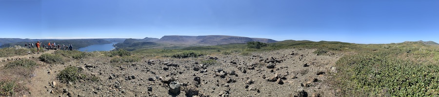 The Discovery Centre is a first class facility with a fantastic geological exhibition and indigenous display. There is also a gift shop and cafe. The centre also serves as the trailhead for Lookout Trail. After spending time here we drove a few minutes down the 431 to the Tablelands. It was very busy there and parking was limited. The gravel trail had a low upward grade to the ending lookout. Like Western Brook Pond, there are benches, but no shelter from the elements, which made this a hot 21 degrees. It’s hard to comprehend the age of the landscape and the journey it took to get to the surface. We had fun exploring the exposed upper mantle, including jumping off of rocks 1.2 billion year old rocks.